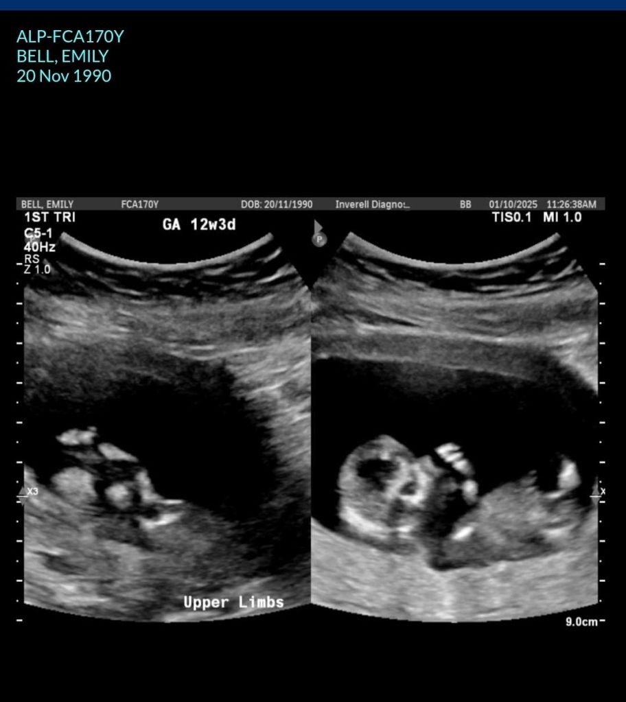 I couldn’t believe it. So I rang doctors the Friday and got into see him straight away. And I walked in and had the test in my wallet. He said how can I help you today Emily. I said I think I know why I have been so sick. He said oh yes whys that. So I pulled the test out and gave it to him. He got me to do bloods to confirm. All came back on Monday and yes I was. So we booked an ultrasound and that Friday I got in. And we saw you for the first time. 8.5 weeks old. We your parents were so surprised, happy, overwhelmed, and just amazed.
